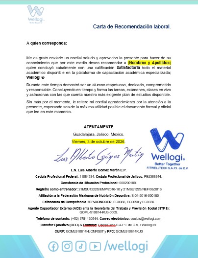 El profesional que termine las 7 Certificaciones / Módulos podrá tramitar su Carta de Recomendación Laboral en donde Wellogi Academy y su CEO, el L.N. Luis Alberto Gómez Martín E.P. justamente dan fe y legalidad del proceso de capacitación académica que supero dicho Profesional.