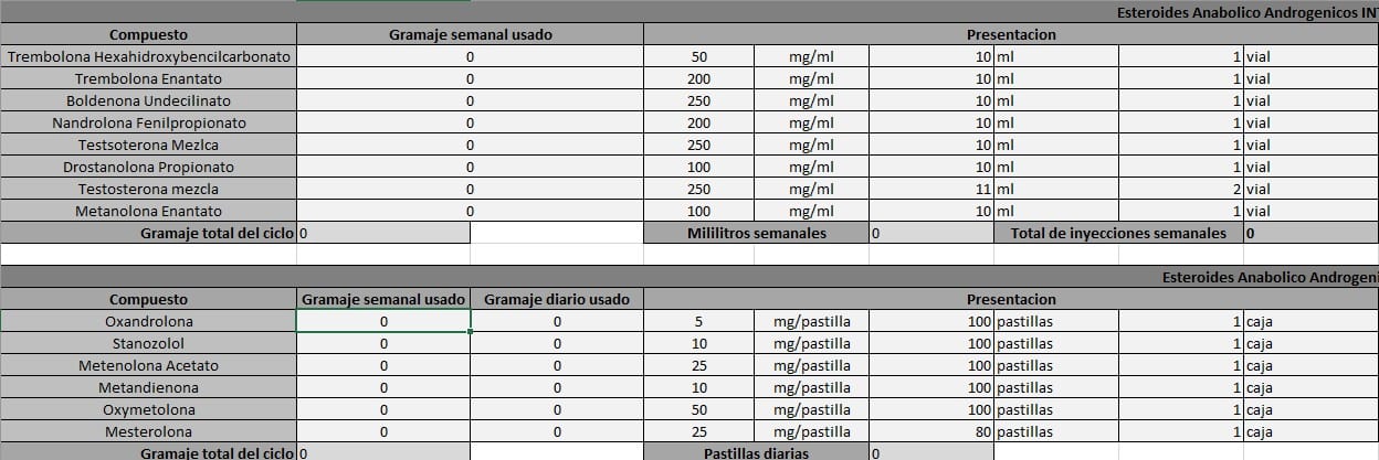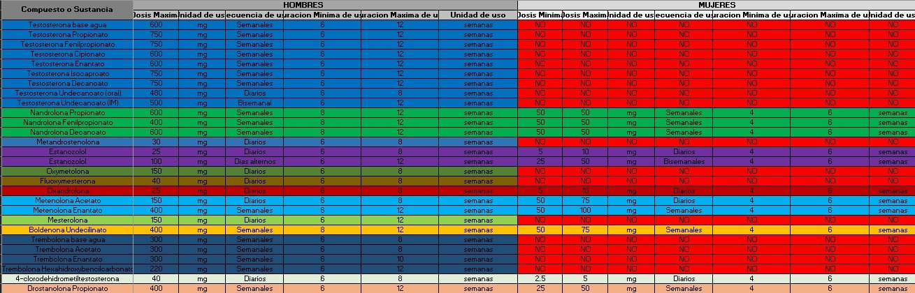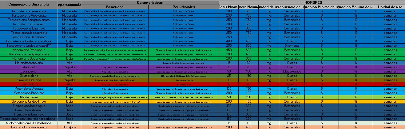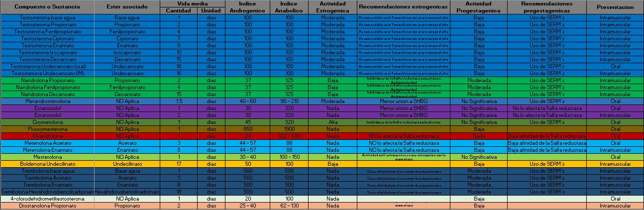- Esteroides Anabólicos Androgénicos (Testosterona, Nandrolona, Metandrostenolona, Estanozolol, Oxymetolona, Fluoxymesterona, Oxandrolona, Metenolona, Mesterolona, Boldenona y Trembolona) con sus características detalladas (Ester asociado, Vida media, Índice androgénico, Índice anabólico, Actividad estrogénica, Recomendaciones estrogénicas, Actividad progestágena, Recomendaciones progestágenas, Presentaciones comercial, Hepatotoxicidad, Beneficios, Riesgos, Dosis mínimas en ambos sexos, Dosis máximas en ambos sexos, Frecuencia de uso en ambos sexos).