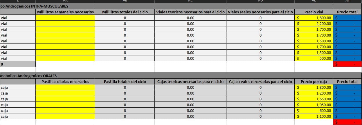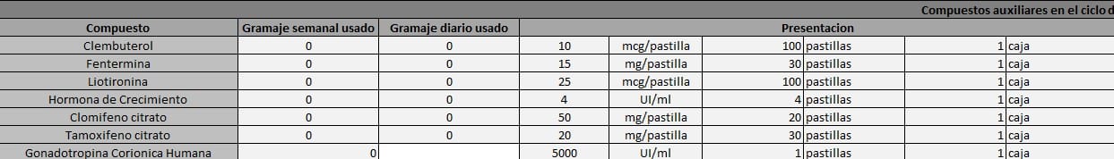 - Planificación del Ciclo (Gramaje semanal usado, Presentación comercial del producto usado, Mililitros semanales necesarios, Viales o Cajas necesarios para todo el ciclo, Costo unitario por cada vial o caja, Costo total del ciclo).