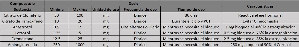 - Moduladores Selectivos del Receptor de Estrógenos (SERM) e Inhibidores de la Aromatasa (Clomifeno, Tamoxifeno, Anaztrozol, Letrozol, Exemestane) con sus características detalladas (Dosis mínima, Dosis máxima, Frecuencia de uso, Tiempo de uso).
