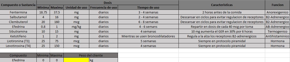 - Simpaticomimeticos y Tiroidales (Fentermina, Salbutamol, Clembuterol, Efedrina, Sibutramina, Ketotifeno, Liotironina y Levotiroxina) con sus características detalladas (Dosis mínima, Dosis máxima, Frecuencia de uso, Tiempo de uso, Función).