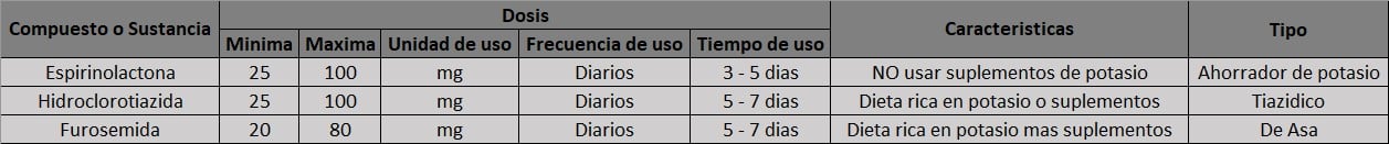 - Diuréticos (Espironolactona, Hidroclorotiazida y Furosemida) con sus características detalladas (Dosis mínima, Dosis máxima, Frecuencia de uso, Tiempo de uso y Tipo).