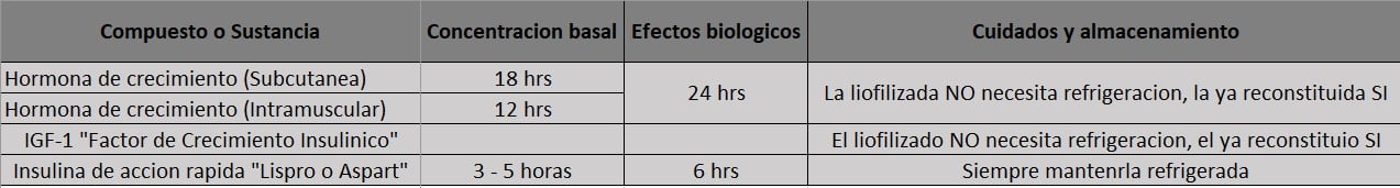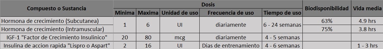 - Polipéptidos (Hormona de crecimiento, Factor de crecimiento insulínico tipo 1, Insulina) con sus características detalladas (Dosis mínima, Dosis máxima, Frecuencia de uso, Tiempo de uso, Biodisponibilidad, Vida media, Concentración basal, Cuidados y almacenamientos).
