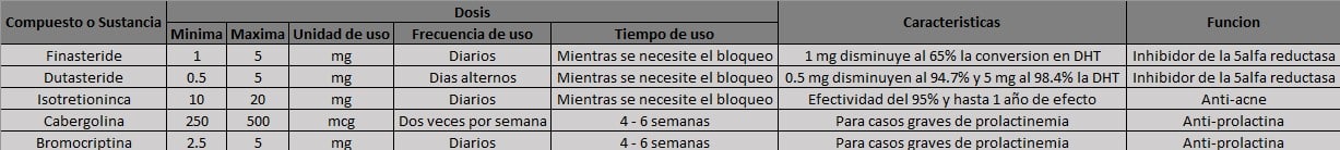 - Compuestos anexos (Finasteride, Dutasteride, Isotretinoina, Cabergolina, Bromocriptina) con sus características (Dosis mínima, Dosis máxima, Frecuencia de uso, Tiempo de uso, Función).